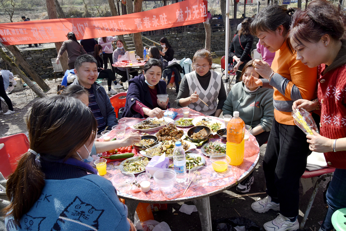 3月8日清早,在財(cái)務(wù)總監(jiān)、婦聯(lián)主任康曉莉的帶領(lǐng)下,公司66名女員工集合乘車,迎著初升的太陽(yáng)從公司汽車工業(yè)園總部出發(fā)。一路上,女神們一邊歡歌笑語(yǔ)、一邊欣賞沿途美景,歷經(jīng)兩個(gè)小時(shí)到達(dá)目的地——南漳印象老家鄉(xiāng)村旅游度假區(qū)。下車后,大家編組整隊(duì),跟隨景區(qū)導(dǎo)游的指引,先是沿途參觀景區(qū)民俗老屋、清淺小溪、碧綠梯田和原野春光等美景,隨后便開(kāi)始自助野炊和燒烤活動(dòng)。女同胞們按照事先編好的小組集合,在導(dǎo)游的安排輔助下,各小組成員分工合作、各負(fù)其責(zé),取食材、拾柴火、生爐子、抓雞、殺魚,紛紛化身野炊大廚、燒烤大師親自烹制、烤制美食,充分展現(xiàn)了女員工們能力超群、善于協(xié)作、勤勞質(zhì)樸的迷人魅力。大家其樂(lè)融融,一邊體驗(yàn)制作美食的樂(lè)趣,一邊享受舌尖上的美味,個(gè)個(gè)臉上都洋溢著燦爛的笑容。野炊、燒烤活動(dòng)后,女神們有的在叢林小憩、有的在小溪上體驗(yàn)操作竹筏,好好享受午餐后的閑暇時(shí)光。之后,大家又前往蔬菜基地,體驗(yàn)了一把蔬菜采摘的辛勞快樂(lè)。