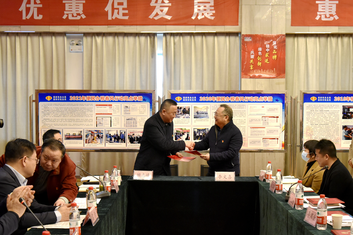 會上,市稅務(wù)局黨委書記、局長雷浩首先致辭講話,隨后市稅務(wù)局黨委委員、副局長張忠友解讀了2022年度“我為納稅人繳費(fèi)人辦實(shí)事暨便民辦稅春風(fēng)行動”工作方案及具體措施,市稅務(wù)局納稅服務(wù)科科長楊進(jìn)宣讀了襄陽市稅務(wù)系統(tǒng)春風(fēng)行動“十項(xiàng)承諾”;舉辦了稅企對接儀式,為10名“春風(fēng)行動稅務(wù)體驗(yàn)師”和10名“專精特新”企業(yè)服務(wù)專員頒發(fā)了聘書;公司黨委書記李總和高新區(qū)稅務(wù)局黨委書記顧志峰共同簽訂了《稅企黨建結(jié)對共建協(xié)議書》,顧志峰書記還代表稅務(wù)部門作了表態(tài)發(fā)言;最后,舉辦了企業(yè)家代表座談,10名參會的企業(yè)家圍繞稅務(wù)部門服務(wù)質(zhì)效、便民辦稅春風(fēng)行動和稅收宣傳月等工作建言獻(xiàn)策,提出了意見建議。