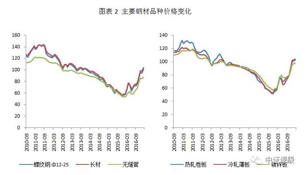 市場供需狀況的改善帶動鋼材價格的回升,螺紋鋼、長材等建筑鋼材以及板材價格在2016年二季度觸底后至今漲幅接近100%。