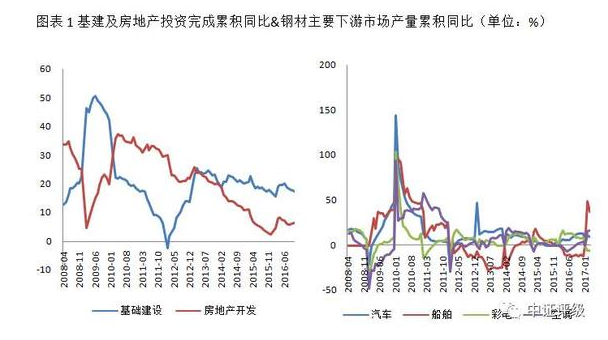 2016年下半年和2017年一季度,鋼鐵市場整體回暖,上游環(huán)保限產(chǎn)、淘汰中頻爐等落后產(chǎn)能以及下游經(jīng)銷商補(bǔ)庫存、地方政府加大基建投資等因素疊加,市場供需狀況趨于好轉(zhuǎn)。房地產(chǎn)投資和基建投資領(lǐng)域接連發(fā)力帶動建筑鋼材下游市場需求的上升,汽車、空調(diào)等板材主要下游市場從2016年上半年開始也有恢復(fù)性增長。